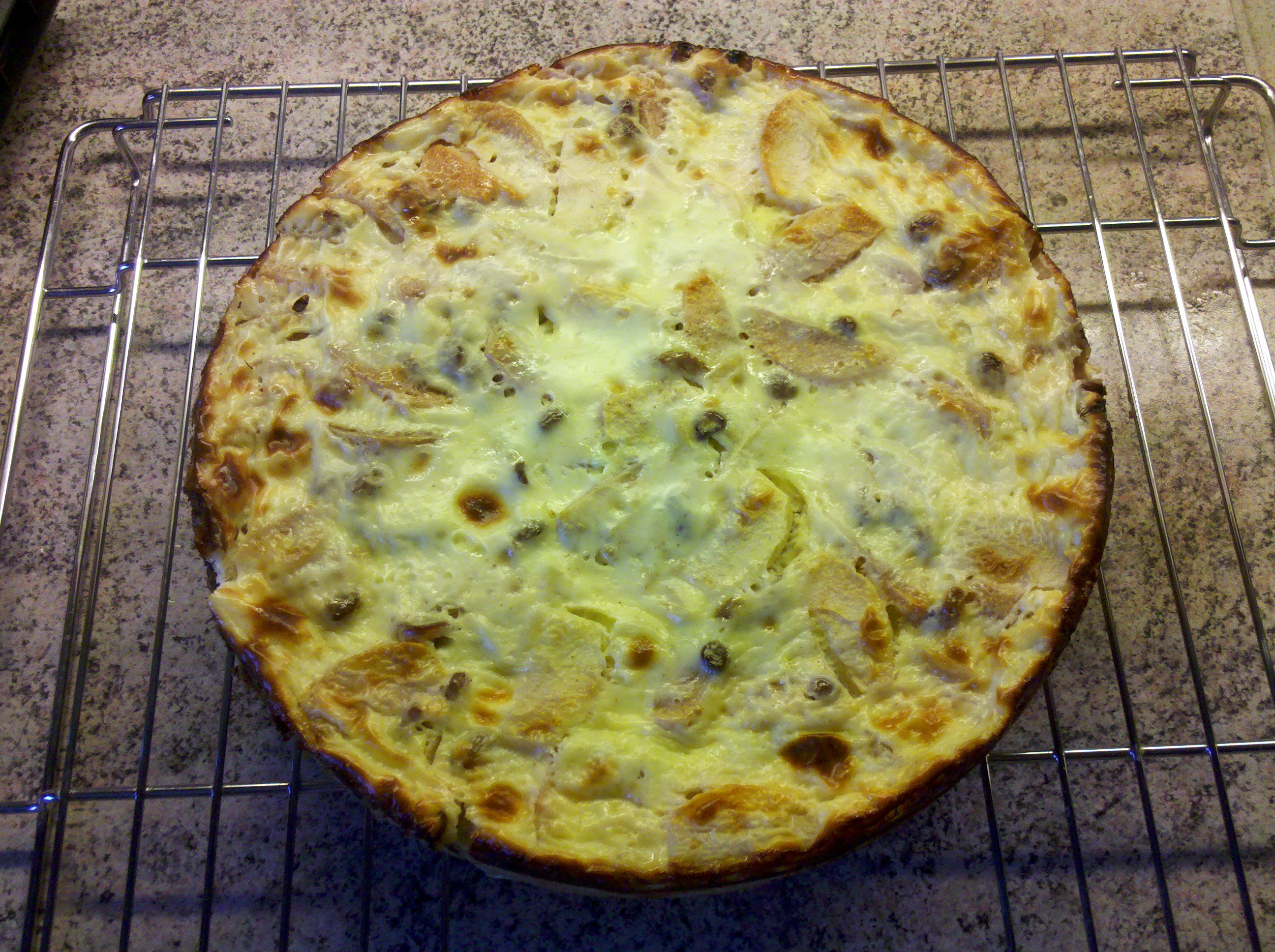 Den verbleibenden Pudding mit dem Ei und der Sahne verrühren und gut über den Äpfeln verteilen.