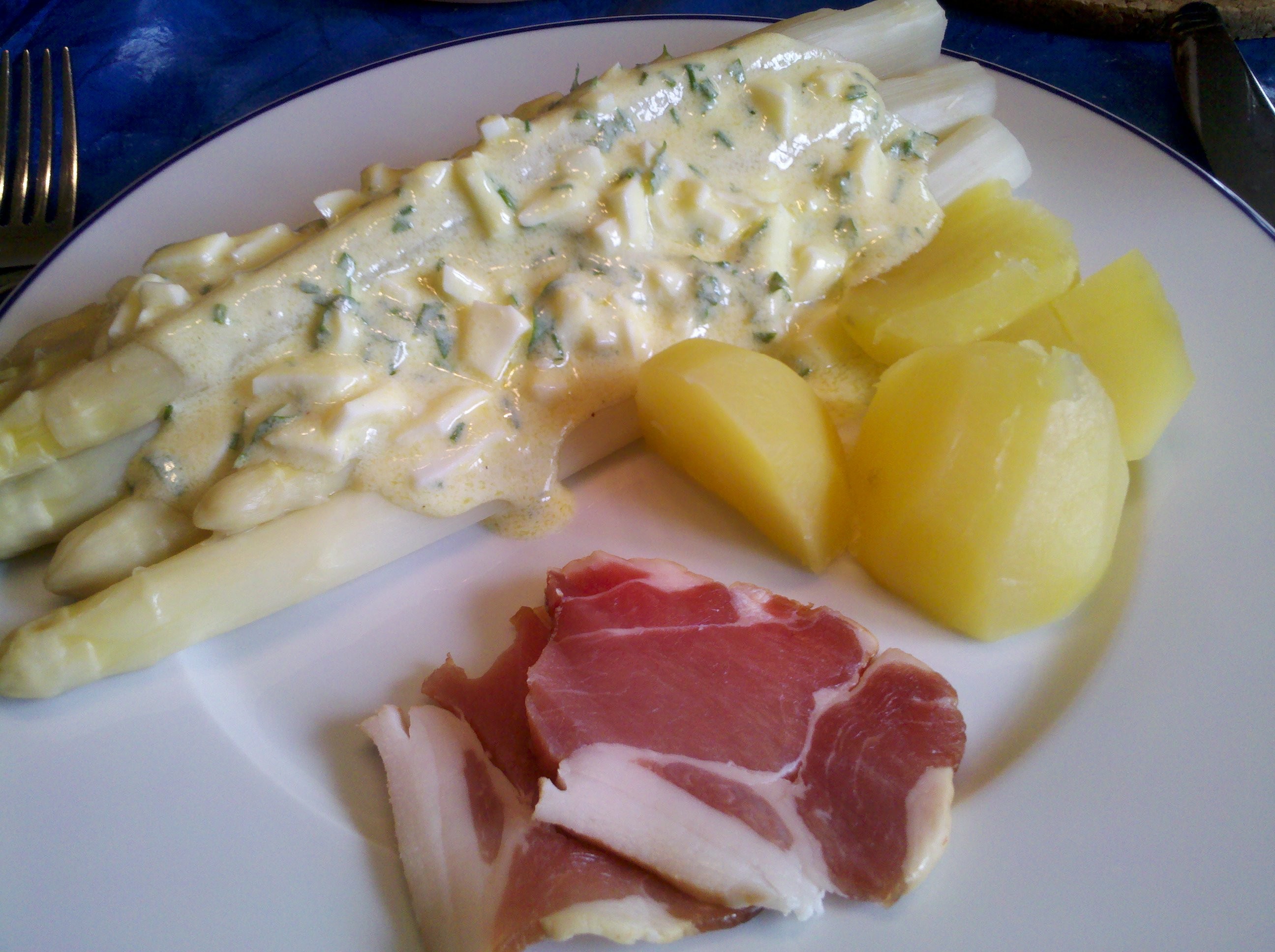 Dazu passt natürlich Spargel, den ich dazu im Bratschlauch zubereitet habe. Einfach geschälten Spargel in den Bratschlauch, mit einer Prise Salz, einer Prise Zucker und einem Hauch gemahlener Muskatnuss ca. 30 min bei 180°C im Backofen garen.