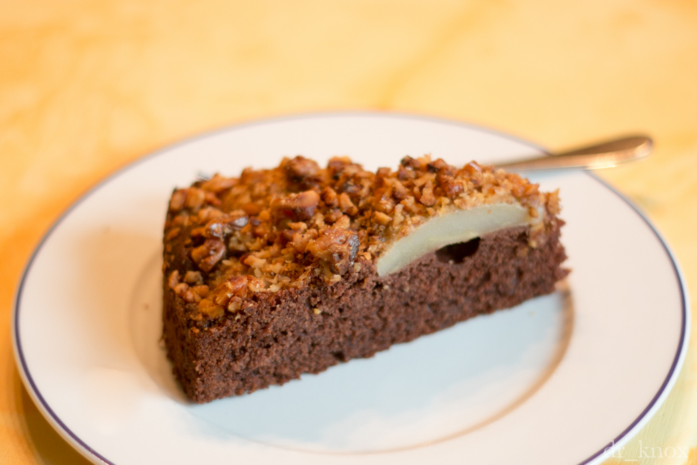 Birnen schälen, vierteln, Kerngehäuse rausschneiden. Sofort in Zitronenwasser zwischenlagern. Birnenviertel gleichmäßig und mit leichtem Druck auf dem Teig verteilen. Walnüsse grob hacken und gleichmäßig über die Birnen streuen.