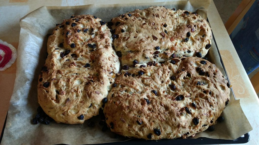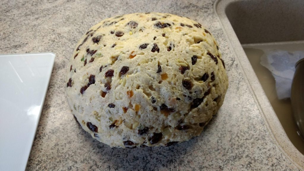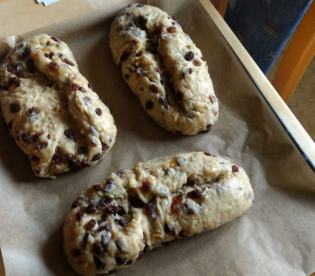 Teig in 3 gleiche Teile teilen, lose Rosinen ablesen, zu Stollen formen und auf ein Backblech geben. Weitere 20 min gehen lassen.