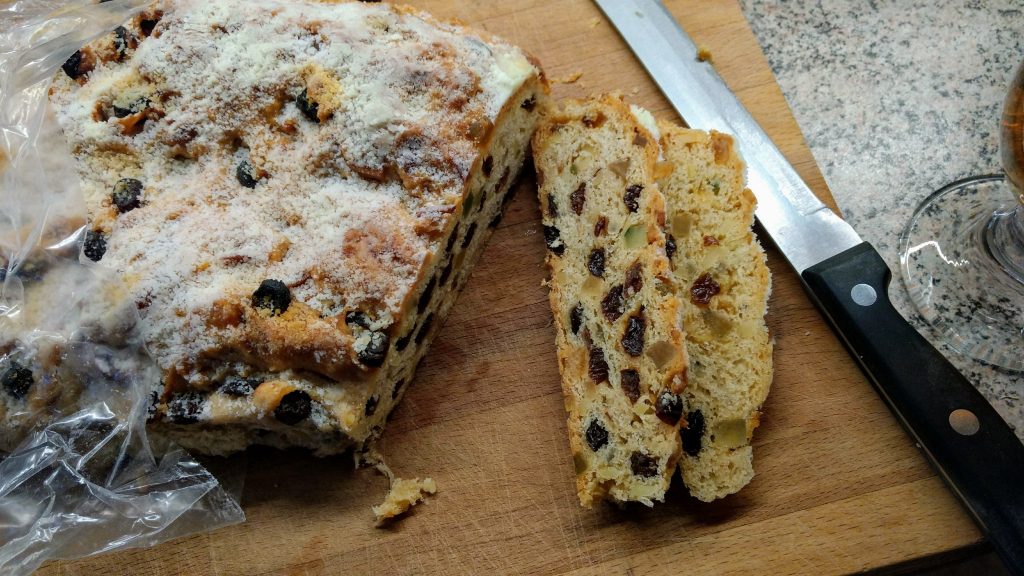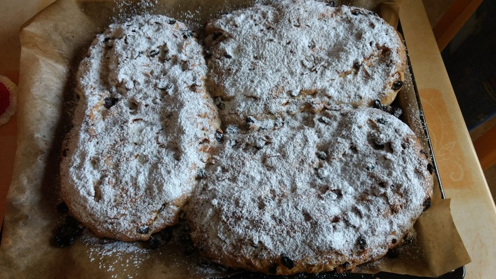 Die Stollen sollten jetzt 3-4 Wochen lagern. (Ich habe sie jeweils in eine Tüte gepackt.)