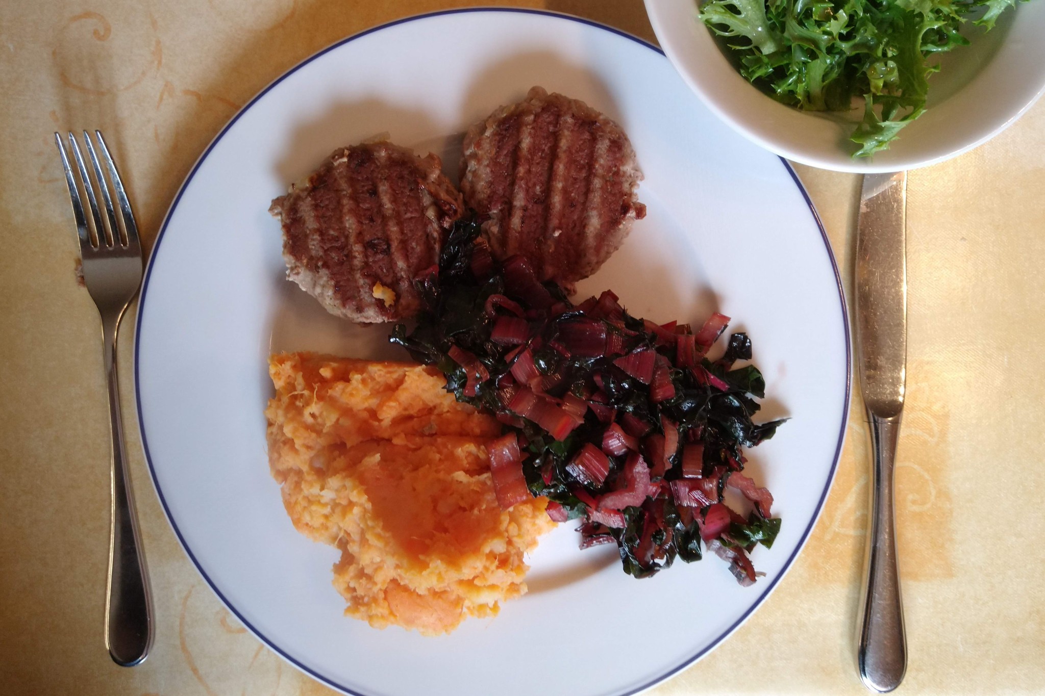 Süßkartoffeln und Kartoffeln (ungefähr 1:1) kochen und mit etwas heißer Milch und einem Stich Butter zu einem Püree stampfen.